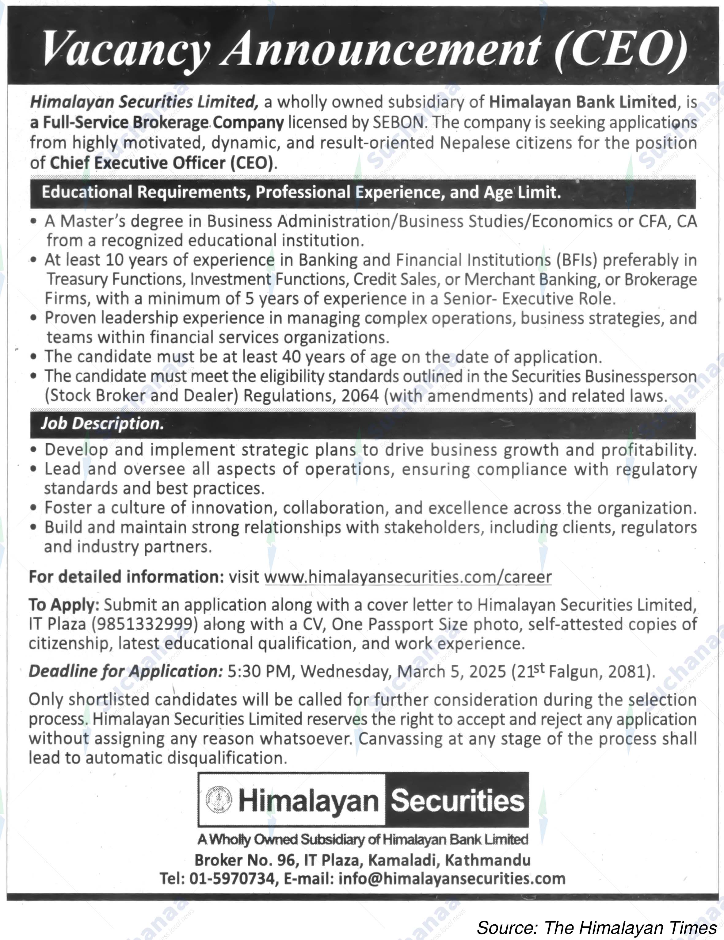 Himalayan Securities Limited, a wholly owned subsidiary of Himalayan Bank Limited, is a Full-Service Brokerage Company licensed by SEBON. The Company is seeking applications from highly motivated, dynamic, and result-oriented Nepalese citizens for the position of Chief Executive Officer (CEO).