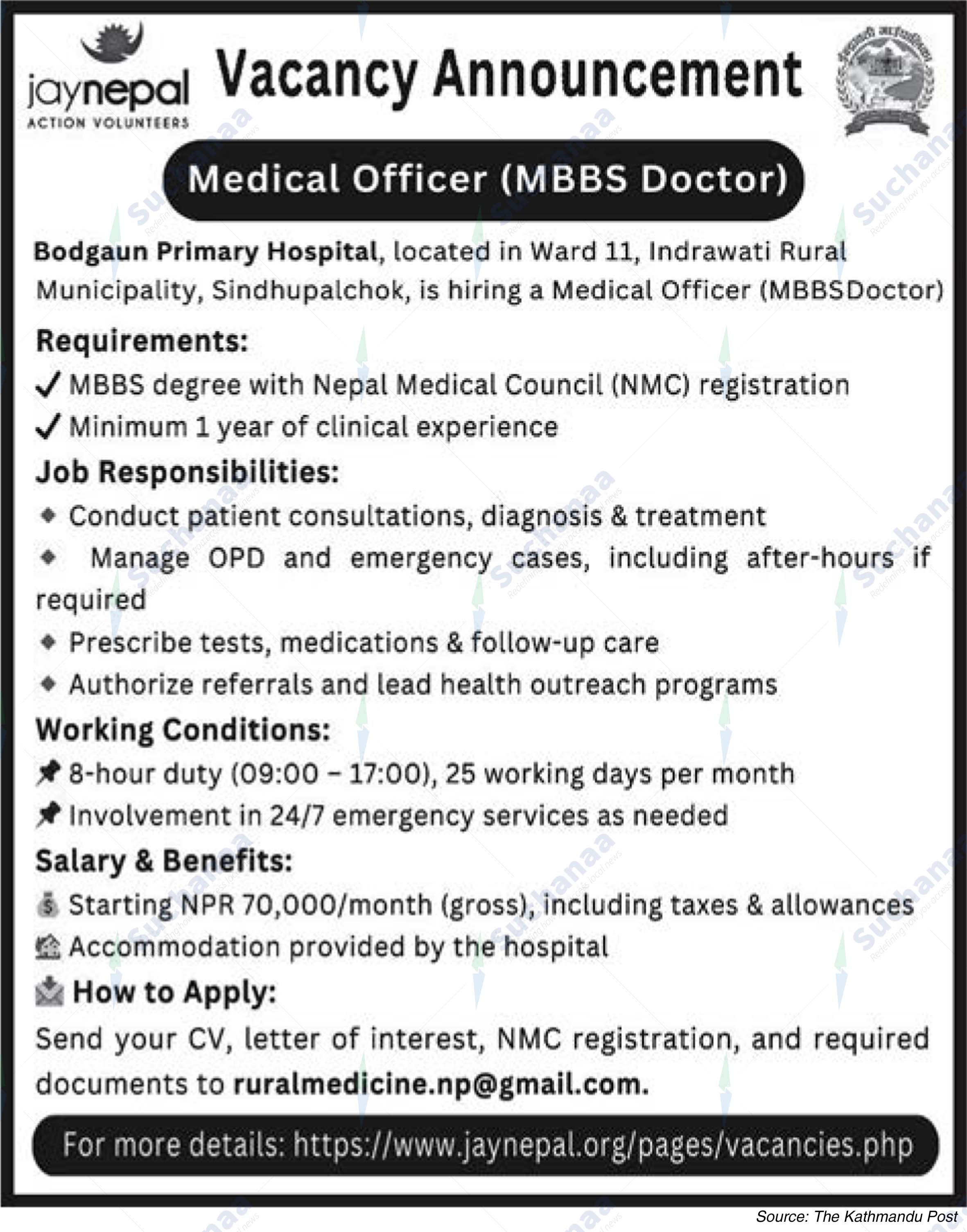 Bodgaun Primary Hospital Located in Ward 11, Indrawati Rural Municipality, Sindhupalchok, is hiriing a Medical Officer (MBBS Doctor).