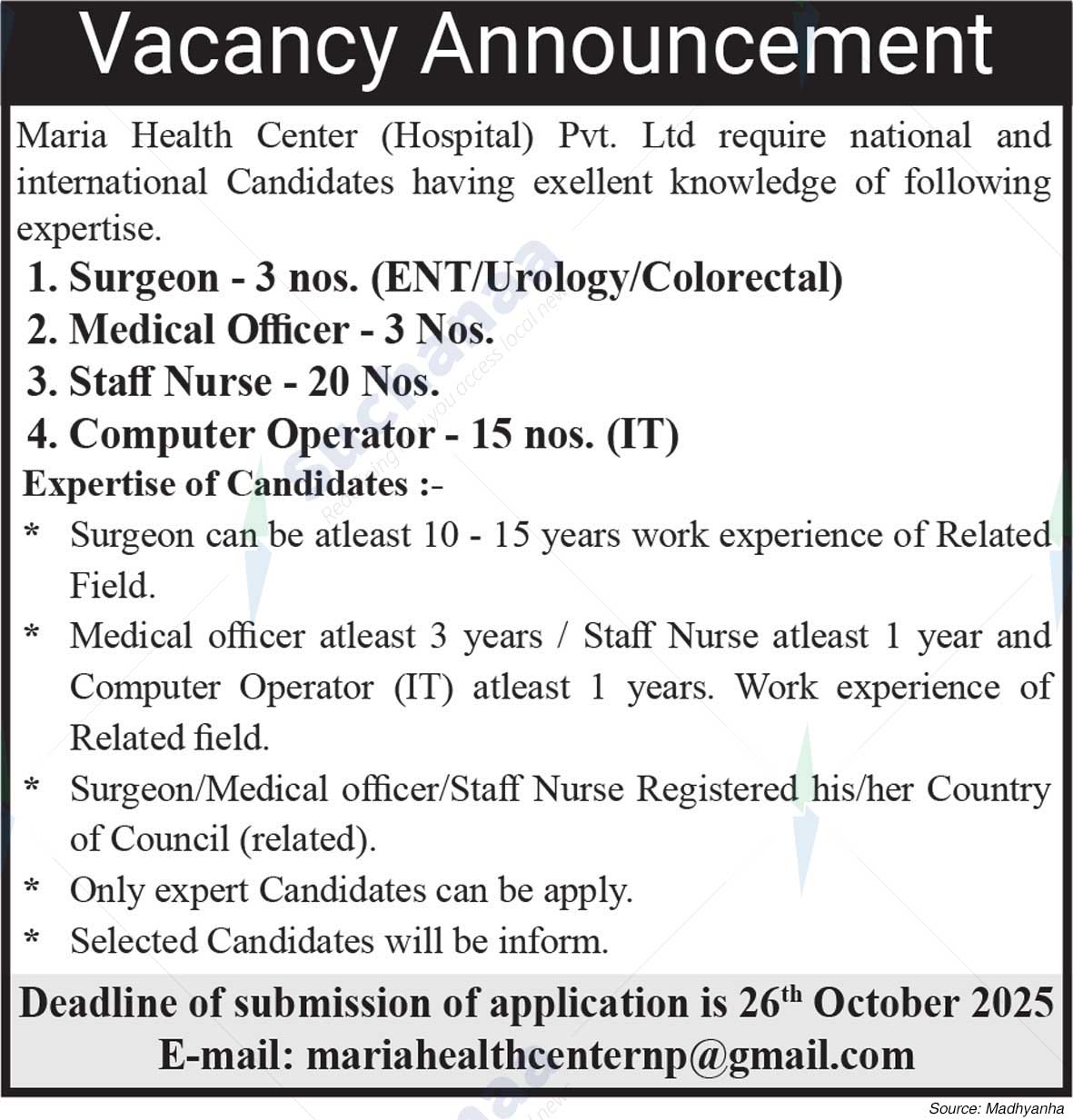 Maria Health Center (Hospital) Pvt. Ltd require national and international Candidates having exellent knowledge of following expertise.
