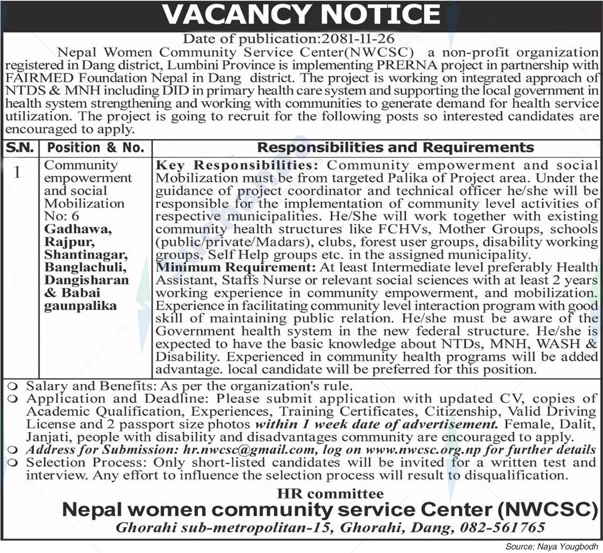 Nepal Women Community Service Center(NWCSC) a non-profit organization registered in Dang district, Lumbini Province is implementing PRERNA project in partnership with FAIRMED Foundation Nepal in Dang district. The project is working on integrated approach of NTDS & MNH including DID in primary health care system and supporting the local government in health system strengthening and working with communities to generate demand for health service utilization. The project is going to recruit for the following posts so interested candidates are encouraged to apply.