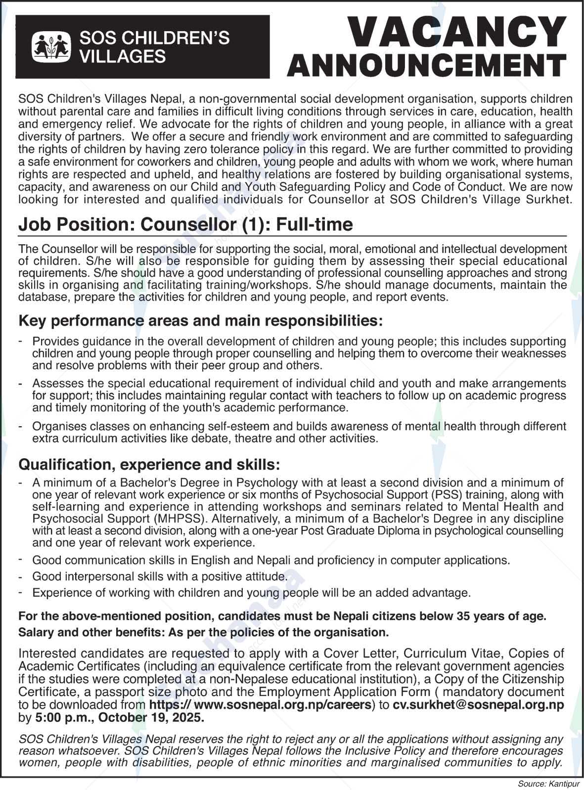 Interested candidates are requested to apply with a Cover Letter, Curriculum Vitae, Copies of Academic Certificates (including an equivalence certificate from the relevant government agencies if the studies were completed at a non-Nepalese educational institution), a Copy of the Citizenship Certificate, a passport size photo and the Employment Application Form (mandatory document to be downloaded from https://www.sosnepal.org.np/careers) to cv.surkhet@sosnepal.org.np by 5:00 p.m., October 19, 2025.